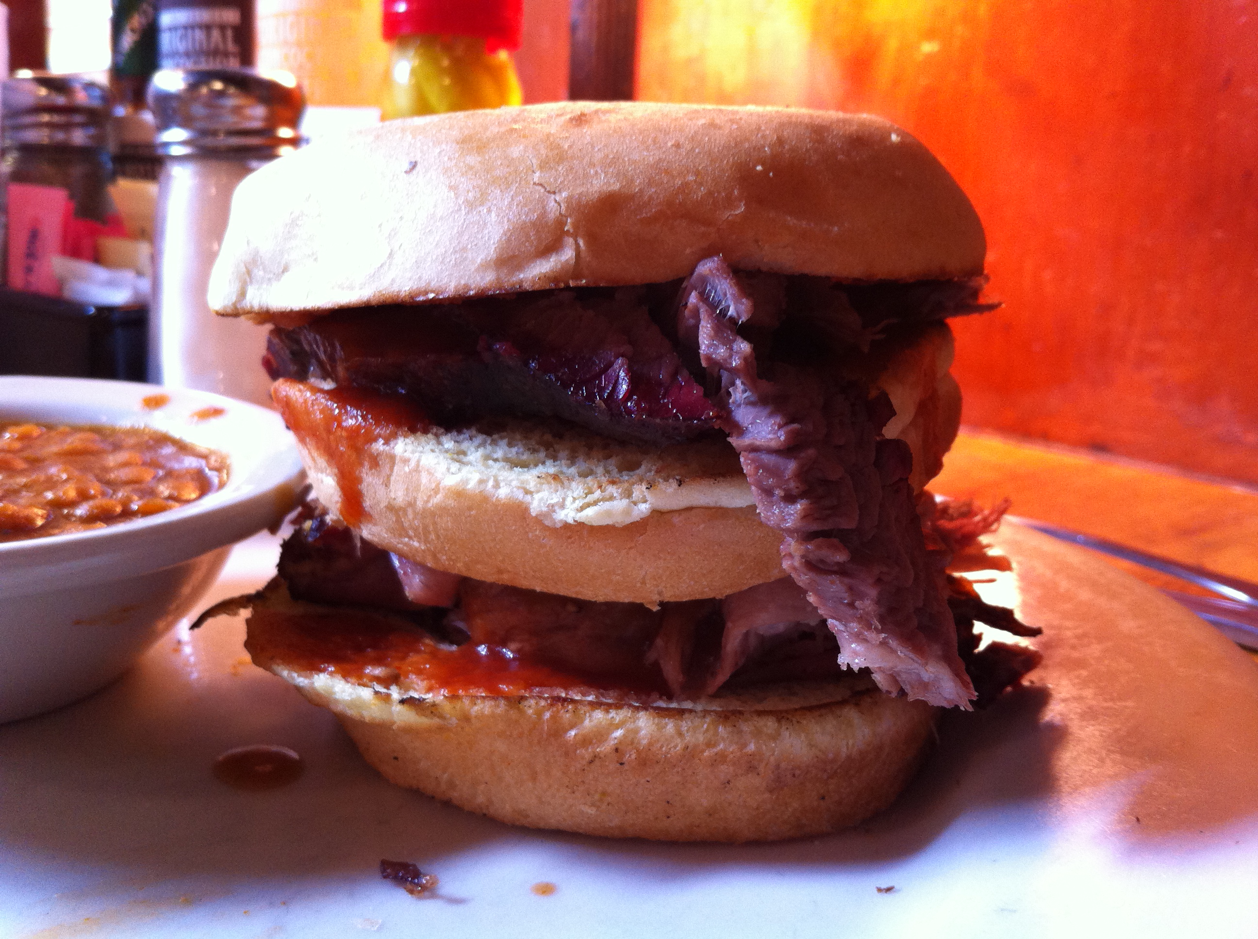 After picking off the pickles (I like to eat them on the side with the sandwich) I was faced with a sandwich that looked like it could in no way fit into my mouth. I took a few seconds thinking of strategy and just about settled on the approach of making two sandwiches: an open-face pork sandwich and a brisket sandwich (I assure you, both of which rock at JnN’s). But then a little voice in the back of my head thought that this was meant to be eaten together so I HAD to employ the squish and stuff method. I can say with the benefit of hindsight that there is no other way to enjoy this sandwich. The flavors of the pork and the brisket are just meant for each other. Both meats were so tender and flavorful. If scientists are in such a hurry to perfect cloning and such, they need to turn their attention to creating an animal that is half-pig and half-cow. That way the entire world can get used to the pure beauty of this combination (from a taste perspective…I’m sure this beast would be ugly as sin).